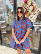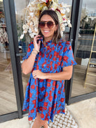 This playful mini dress features ruffle sleeves and neckline, along with pleated bust details for a touch of whimsy. The flowy style and floral pattern make it the perfect choice for a fun and flirty evening out.
