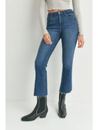 Take your denim game to the next level with our Dark Denim Tonal Crop Flare. Made from super stretch fabric, these high waisted jeans provide a flattering fit while the unfinished hem and crop flare add a trendy touch. Perfect for those who like to have fun with their fashion (and their word play!).