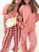 Unleash your inner fashionista with our Noura Textured Gingham Pant! Featuring a trendy gingham pattern and a comfortable elastic waist with drawstring, these pants are perfect for any stylish, on-the-go individual. Say goodbye to boring pants and hello to stylish comfort!