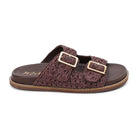 Brown woven raffia slide sandals with adjustable gold-tone buckles, a cushioned footbed, and a sturdy sole. A breezy, laid-back style perfect for warm-weather outings.