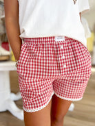 Add a fun twist to your loungewear with these playful red and white check boxer shorts. Featuring a delicate lace trim hem and a comfy elastic waistband, they blend comfort with a flirty touch.