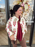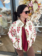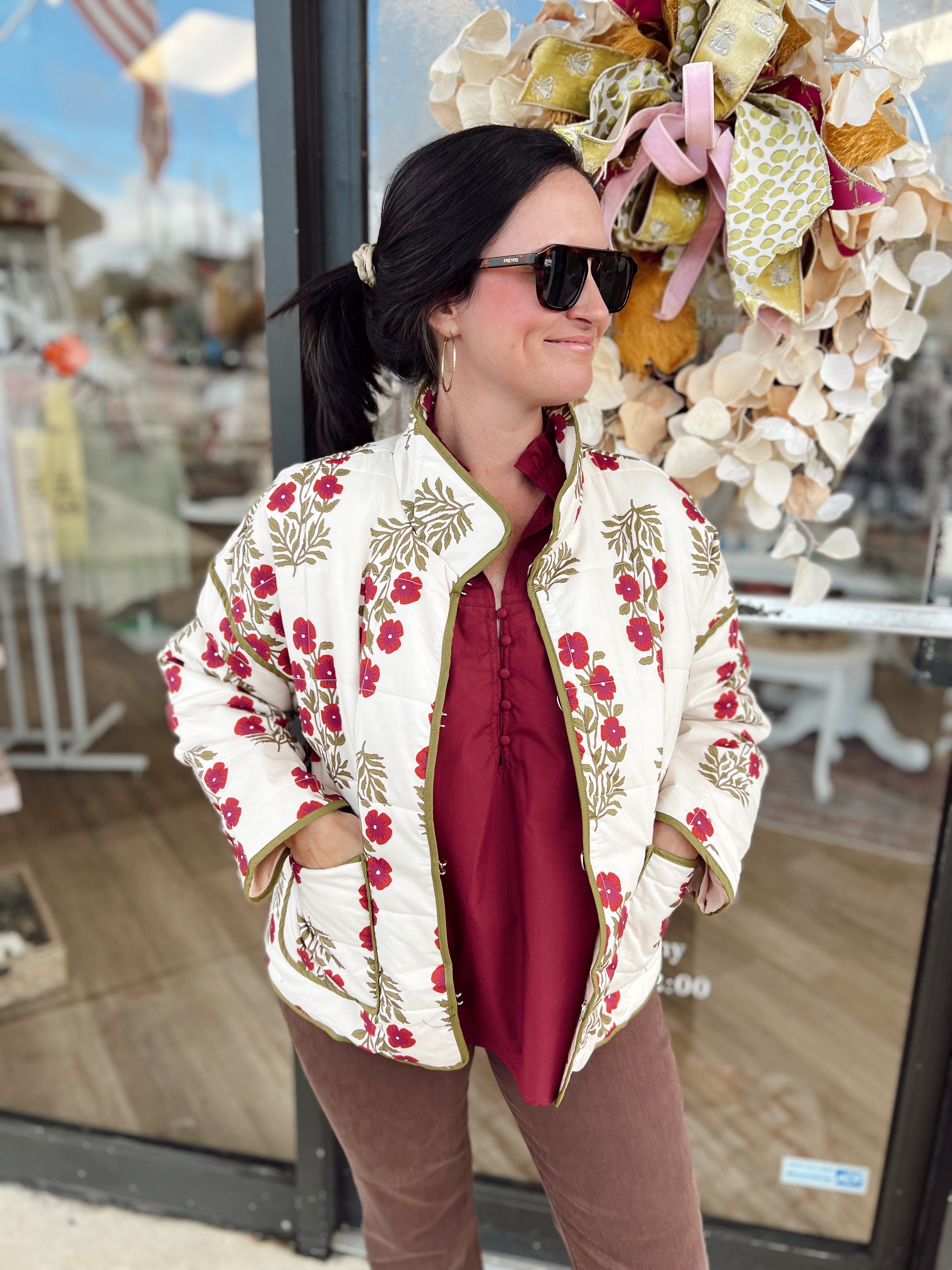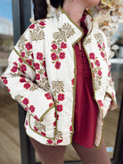 This Berry Block Print Jacket features a unique block print pattern and a relaxed fit for a stylish and comfortable look. The quilted material provides warmth, while the mock neck collar and front pockets add functionality. Perfect for adding a pop of color to your outfit.