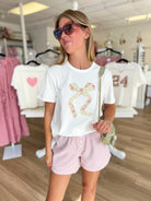 This playful white tee features a classic round neck and short sleeves, perfect for everyday comfort. The standout bow graphic is filled with a charming quilted pattern, adding a fun and textured twist to your casual look.