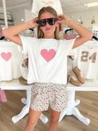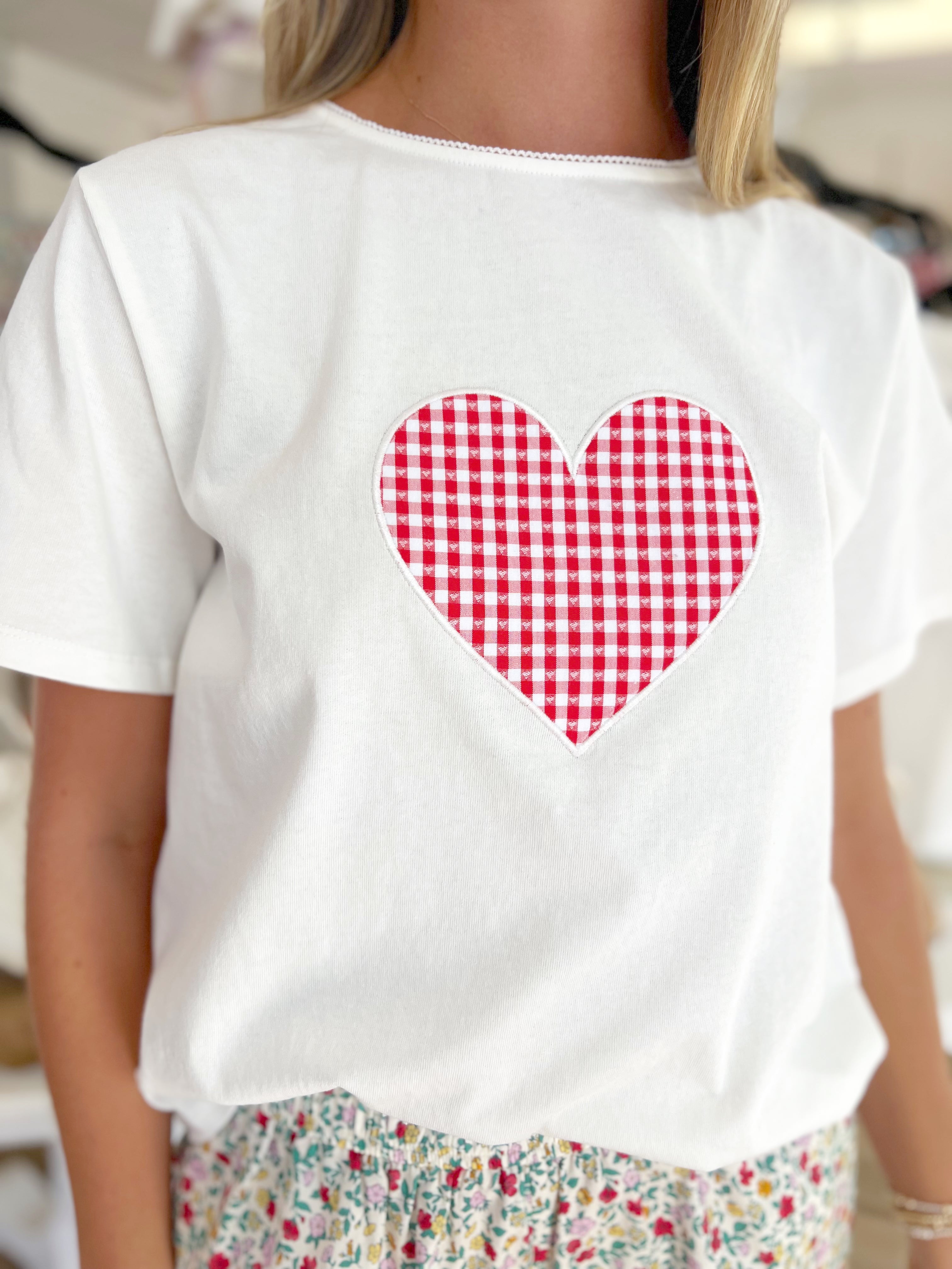 This playful white round neck tee features a relaxed fit for all-day comfort. The standout detail is a charming patch heart graphic filled with vibrant red gingham, adding a fun and flirty touch to your casual look. Perfect for pairing with jeans or shorts, it brings a sweet pop of pattern to your everyday wardrobe.