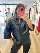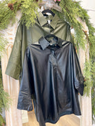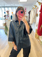 Reach new fashion heights with this oversized leather top! Made from faux leather, this short sleeve blouse features a button-up front and a trendy collar. Perfect for adding a touch of edginess to any outfit. (Get ready to slay in this faux leather top, FYI.)