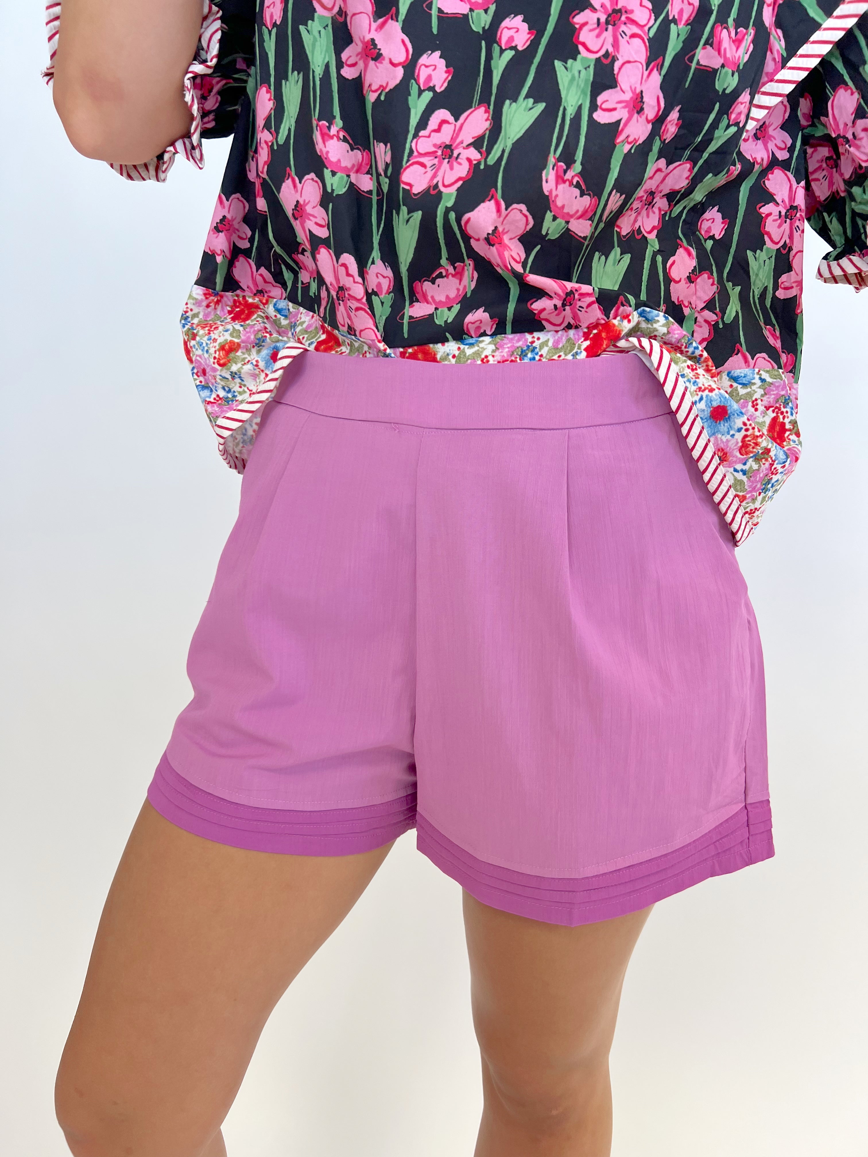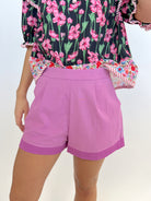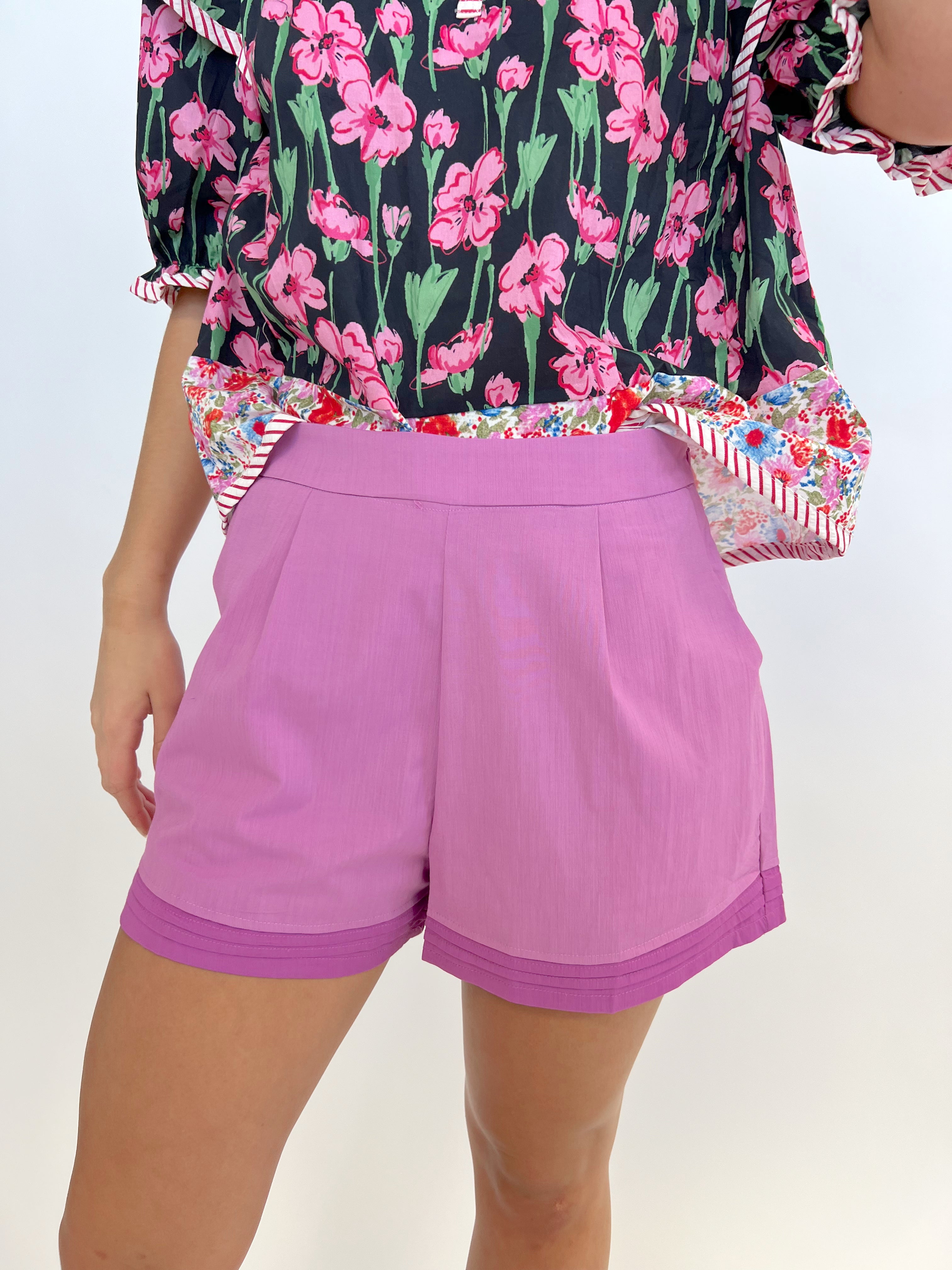 These cute Plum Pleated Shorts feature a flattering high waist and a unique layered hem for a playful touch. With convenient pockets and a zip closure on the side, they offer both style and function. The tone on tone design adds a subtle yet chic element to any outfit.